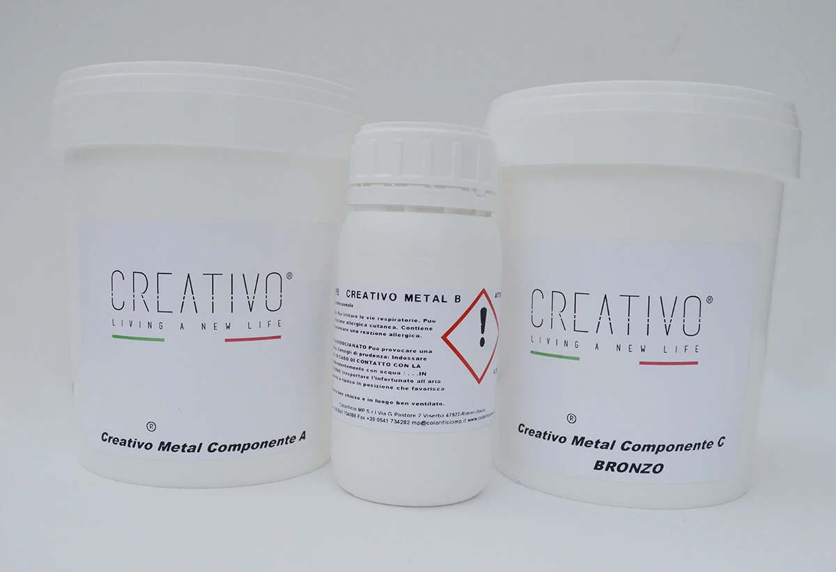 CREATIVO METAL rappresenta un’innovazione assoluta nell’ambito della decorazione: puro metallo liquido che si applica con la facilità di una pittura e facilmente plasmabile. L’applicazione di CREATIVO METAL permette di impreziosire pareti, pavimenti ed elementi di arredo (tavoli, mobili, banconi…), ottenendo superfici lisce come lamine di metallo o effetti più materici che riprendono le lavorazioni dei più esperti artigiani italiani. Completamente a base acqua, CREATIVO METAL è un rivestimento metallico per la decorazione di muri, pavimenti, elementi d’arredo, ecc. Con CREATIVO METAL, puoi trasformare le superfici in oggetti preziosi.