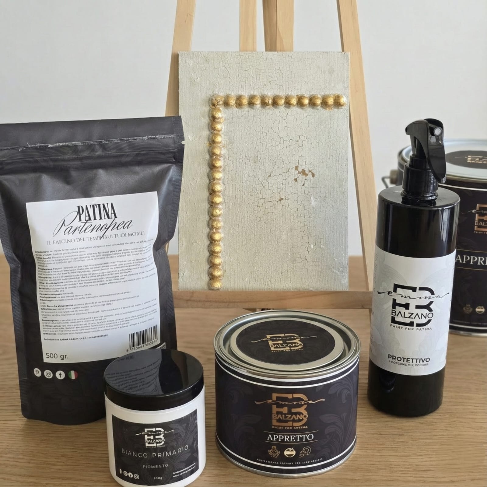 Se siete entusiasti di restituire vita e una nuova identità ai vostri mobili o oggetti e desiderate dare loro un look vissuto, elegante e ricco di storia, lo Starter Kit per Patina Partenopea è il vostro punto di partenza ideale!