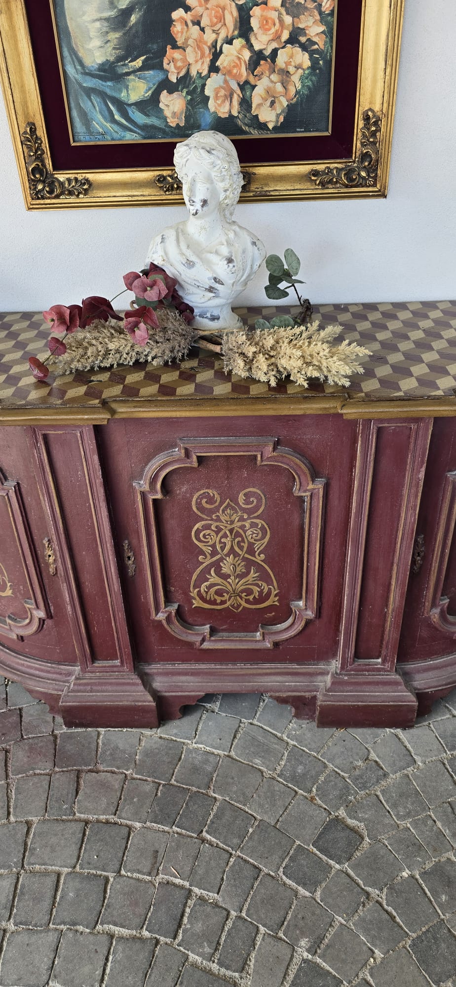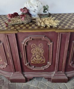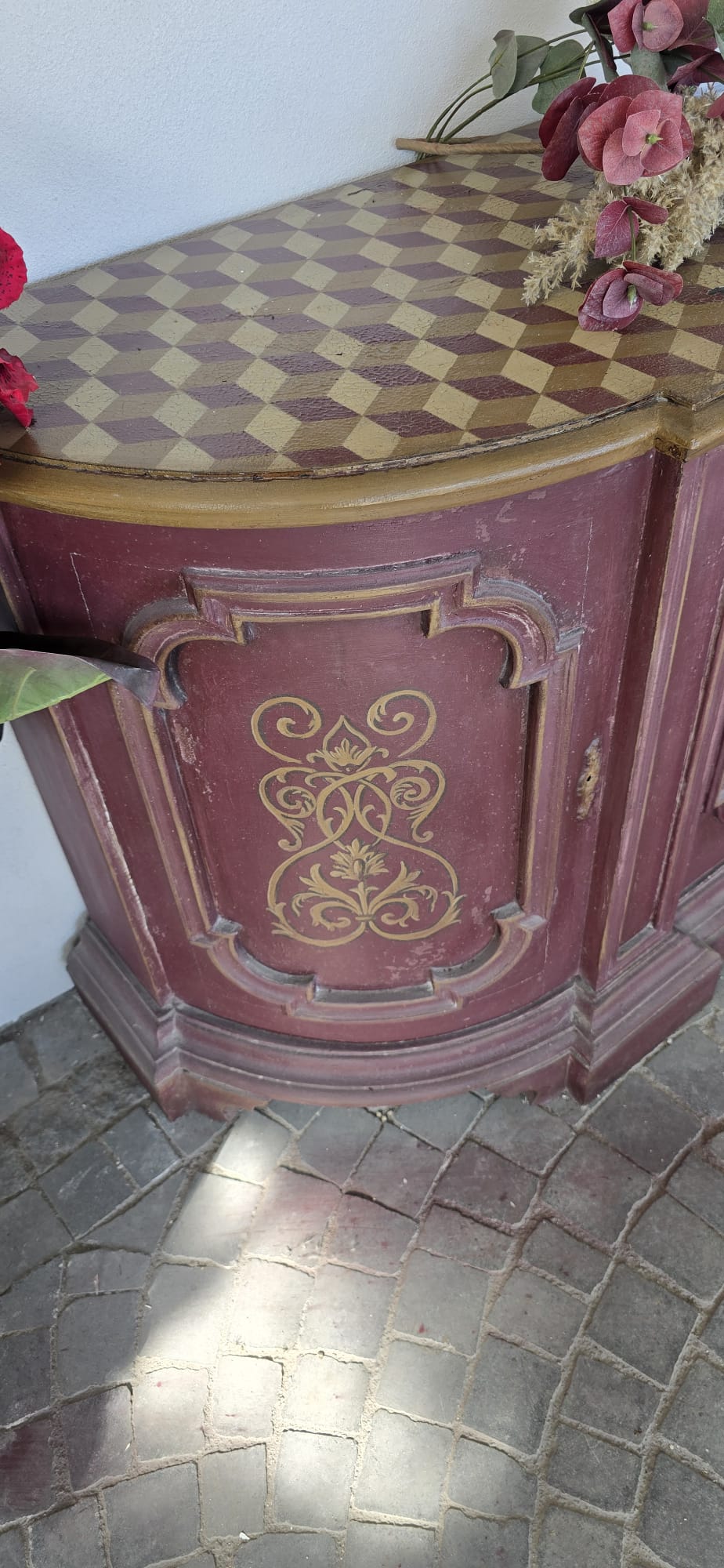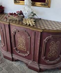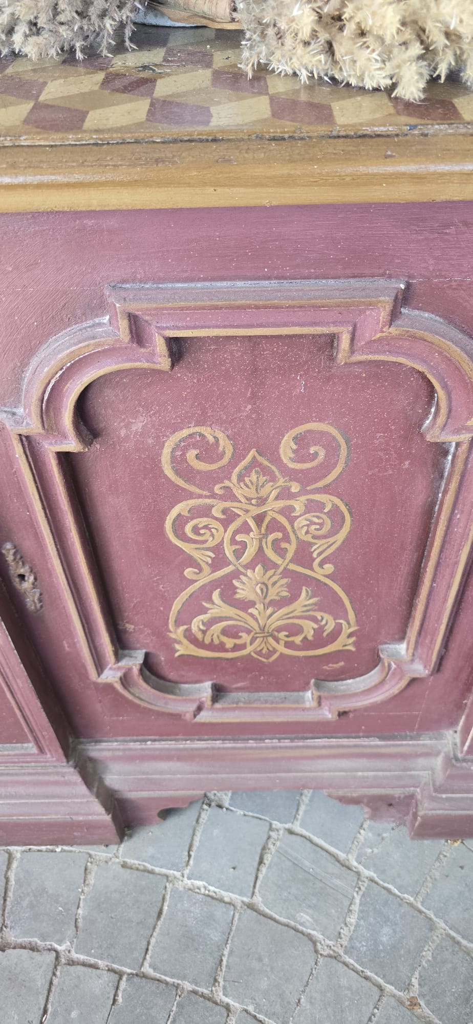 Credenza tre ante in legno massello finemente decorata in patina antica, completamente decorata a mano nei toni del prugna/senape .