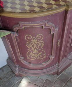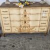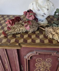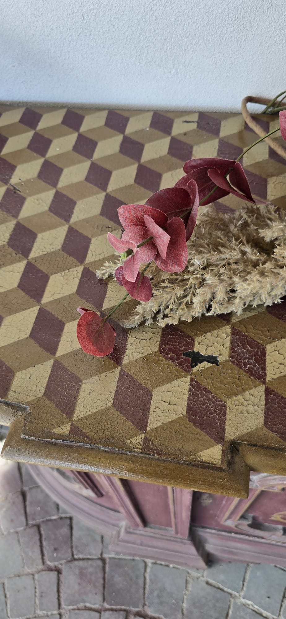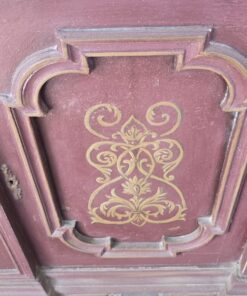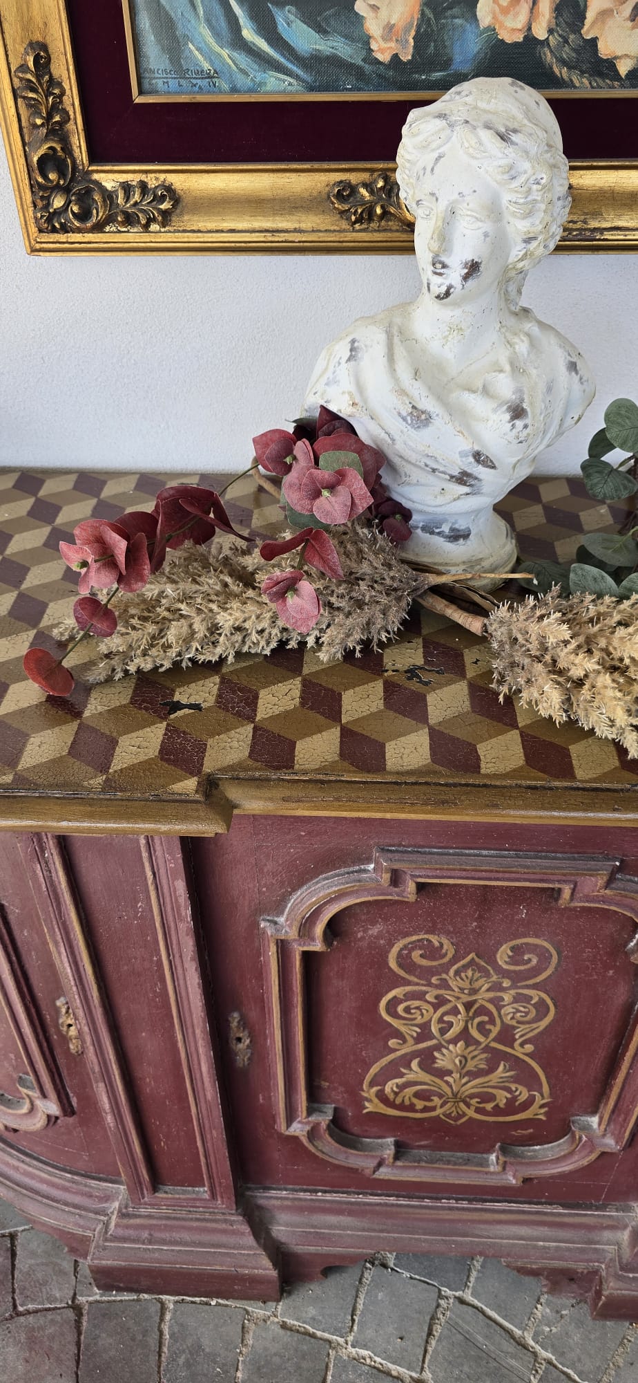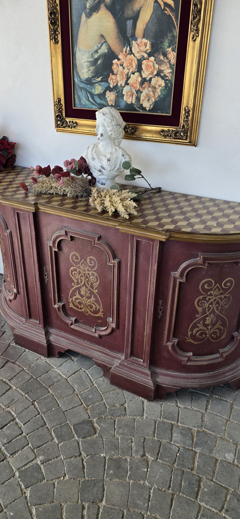 Credenza tre ante in legno massello finemente decorata in patina antica, completamente decorata a mano nei toni del prugna/senape .
