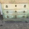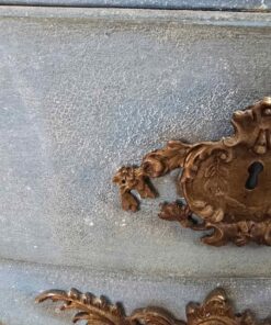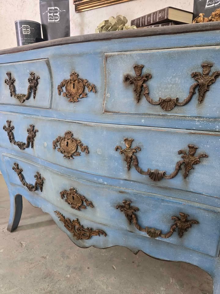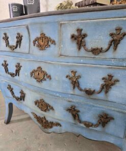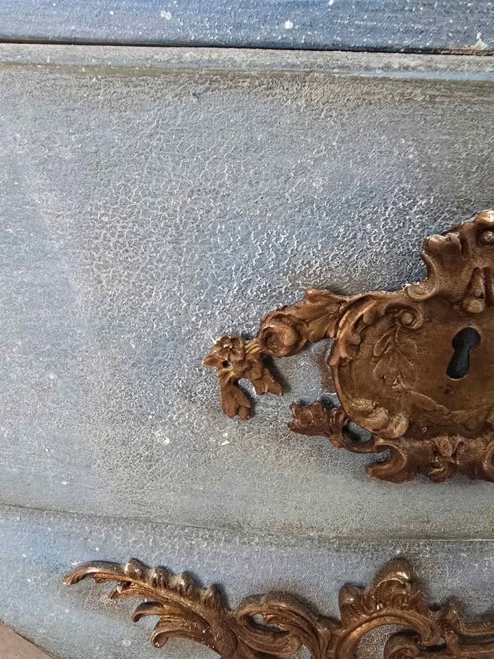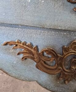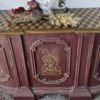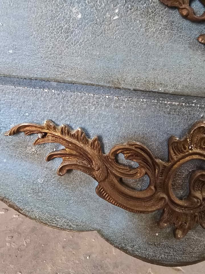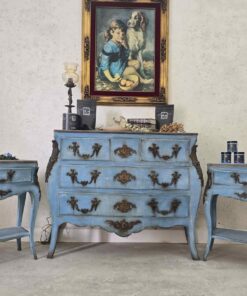 Trittico bombato riproduzione francese con ferramenta originale 800′ Finemente decorato in patina alla caseina, patina partenopea nei toni del blu Ercolano. Ripiani nuovi, con possibilità di avere i ripiani in marmo con rosa fume’.
